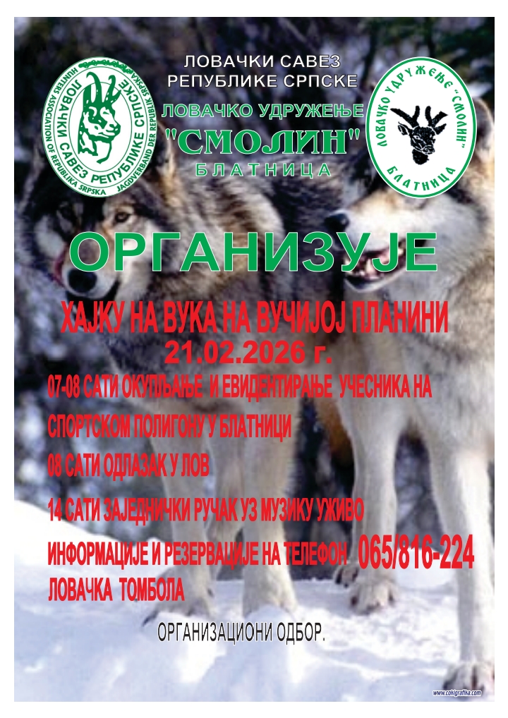 Lovačko udruženje "Smolin" Blatnica organizuje tradicionalnu hajku na vuka na Vučijoj planini 21.02.2026. godine. Okupljanje i evidencija lovaca od 07:00 do 08:00 na sportskom poligonu u Blatnici. U 08:00 odlazak u lov, 14:00 zajednički ručak uz muziku uživo. Informacije i rezervacije na 065/816-224. Ove godine i lovačka tombola